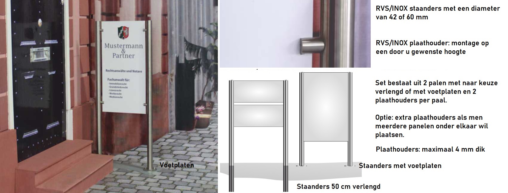 Set staanders - Deze RVS/INOX buitenbewegwijzeringsportalen zijn door het tijdloze design breed toepasbaar. De staanders zijn standaard voorzien van 2 RVS/INOX plaatklemmen voor platen van maximaal 4 mm dik. Tussen deze staanders monteert u 1 of meerdere panelen. Optie: extra sets RVS plaathouders. Montage vindt plaats door de staanders in het beton te plaatsen of bij staanders met voetplaten om deze staanders op een bestaande harde ondergrond te schroeven. Exclusief paneel, belettering, montage en ontwerp; tegen meerprijs kunnen wij dat wel voor u verzorgen.