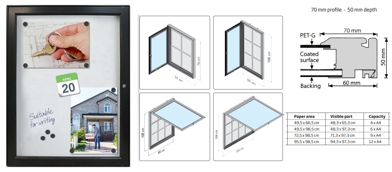 Zwart gepoedercoat 70 mm aluminium profiel. Binnendiepte 26 mm. Voorzijde van slagvast PET-G. Witte achterplaat van staal en geschikt voor whiteboardstiften en magneten. Incl. montageprofielen, schroeven, pluggen en vier magneten per A4-poster. Zie voor afmetingen en gewichten bijgevoegde afbeelding.